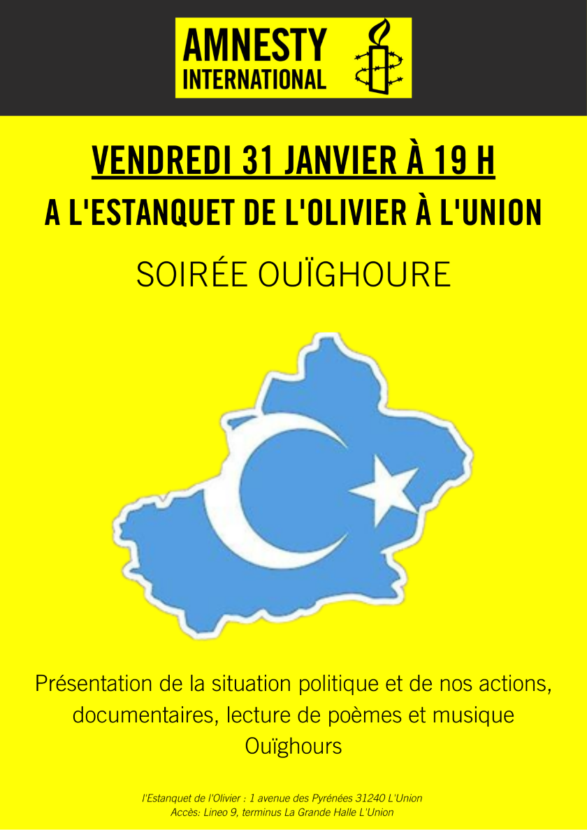 Conférence d’Amnesty International sur les Ouïghours Vendredi 31 janvier à 19 heures à l’Estanquet de l’Olivier Rejoignez-nous le vendredi 31 janvier 2025 à l’Estanquet de l’Olivier pour une conférence gratuite (durée 1 heure) et captivante, présentée par Amnesty sur la violation des droits humains au Xinjiang, où nous explorerons la situation actuelle des Ouïghours comme […] |