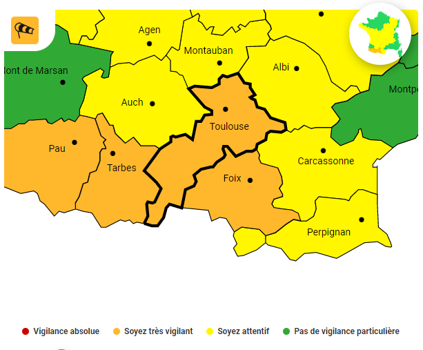 De mardi 20 octobre à 20h au mercredi 21 octobre à 6h, le département de la Haute-Garonne ainsi que 3 autres départements limitrophes sont placés en Zone de vigilance orange pour vents violents.