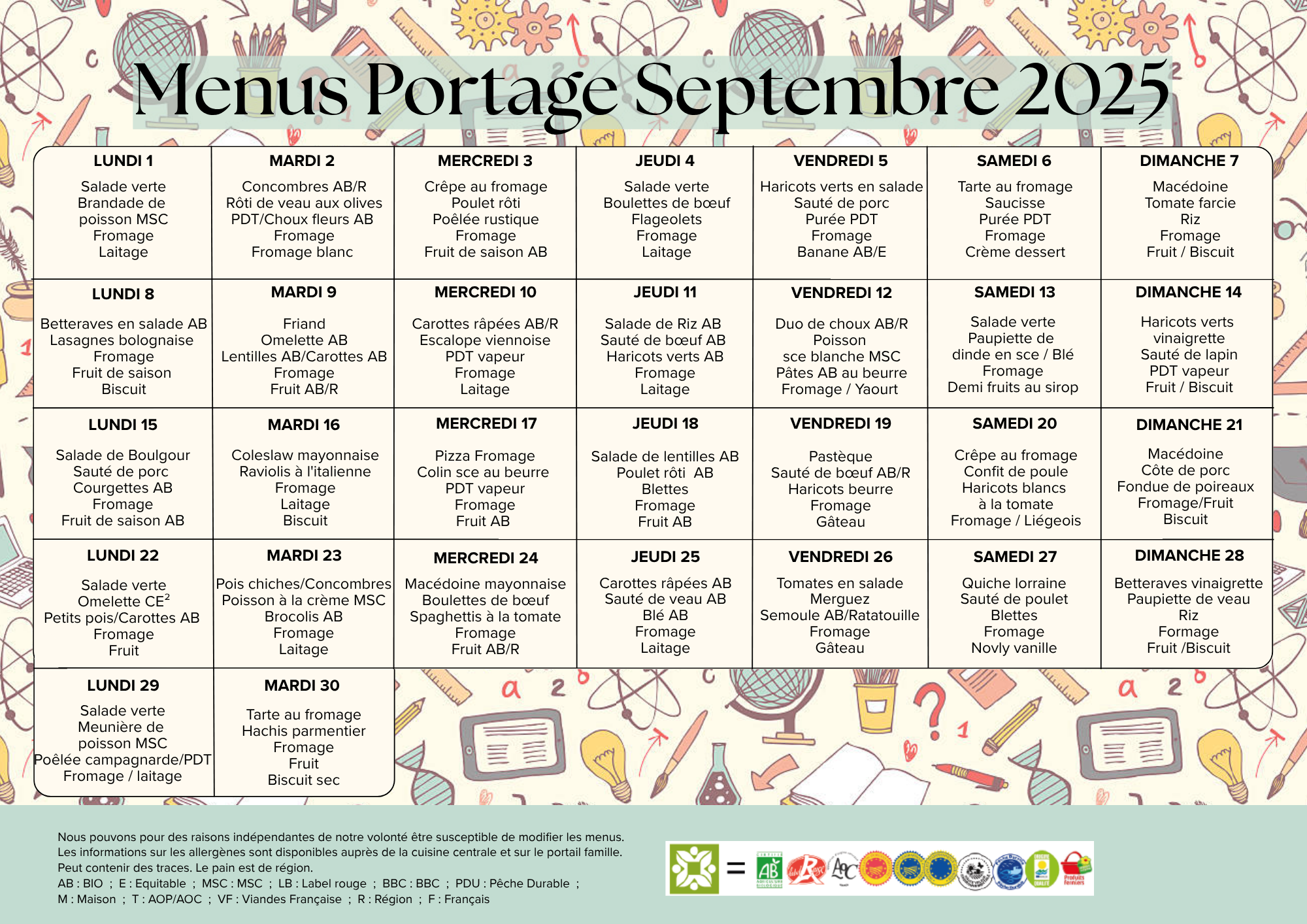 MENU PORTAGE OCTOBRE 2025