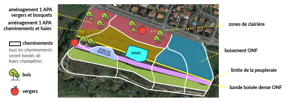 La forêt en cours de constitution comprendra des clairières, des chemins de balade, des zones de quiétude pour la faune, des vergers. Sa conception tient compte des exigences de la transition écologique (climat, biodiversité…).