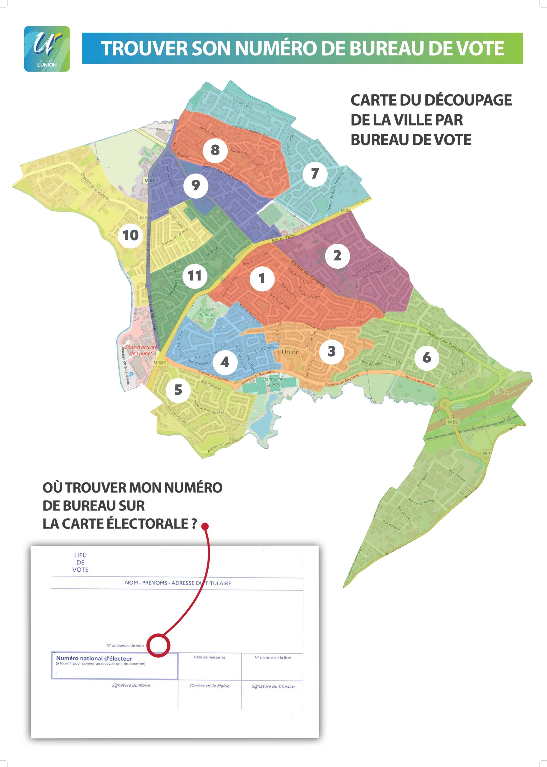 Les citoyens inscrits sur les listes électorales de L’Union sont appelés à se rendre à la Grande Halle. Les bureaux de vote seront ouverts de 8h à 20h. Pour retrouver le numéro de votre bureau de vote, consultez la carte ci-dessous.