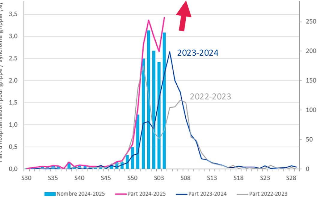 L’épidémie saisonnière de grippe au cours de cet hiver 2025 se caractérise par la co-circulation de 3 variants : A(H1N1), A(H3N2) et B/Victoria. Face à ces différentes souches, les sources de propagation de la grippe sont donc accrues. Cela se caractérise par une forte augmentation des hospitalisations, des risques accrus pour les personnes vulnérables et des indicateurs à nouveau en forte progression en cette fin du mois de janvier. La région Occitanie est concernée par cette hausse épidémique.