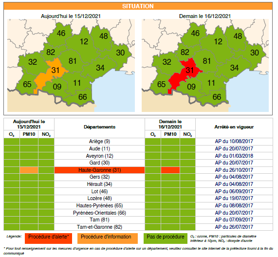 La Préfecture a informé toutes les communes de Haute-Garonne de la survenue d’un épisode de pollution de l’air aux particules en suspension (PM10) pour la journée du 15 décembre. Cet épisode de pollution se poursuivra tout au long de la journée du jeudi 16 décembre.