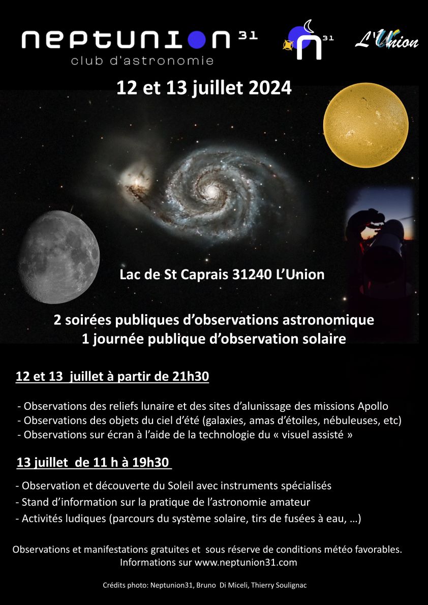 Le vendredi 12 et le samedi 13 juillet , à partir de 21h30, petits et grands pourront venir observer les reliefs lunaire et autres splendeurs du ciel nocturne , à travers les différents instruments d’observation qui seront installés près de la salle Laroussinie au lac de Saint-Caprais.
