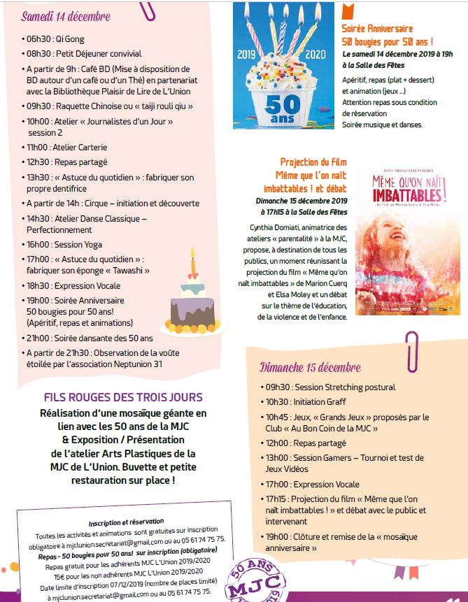 Date limite d’inscription 07/12/2019 (nombre de places limité) à mjclunion.secretariat@gmail.com ou au 05 61 74 75 75.