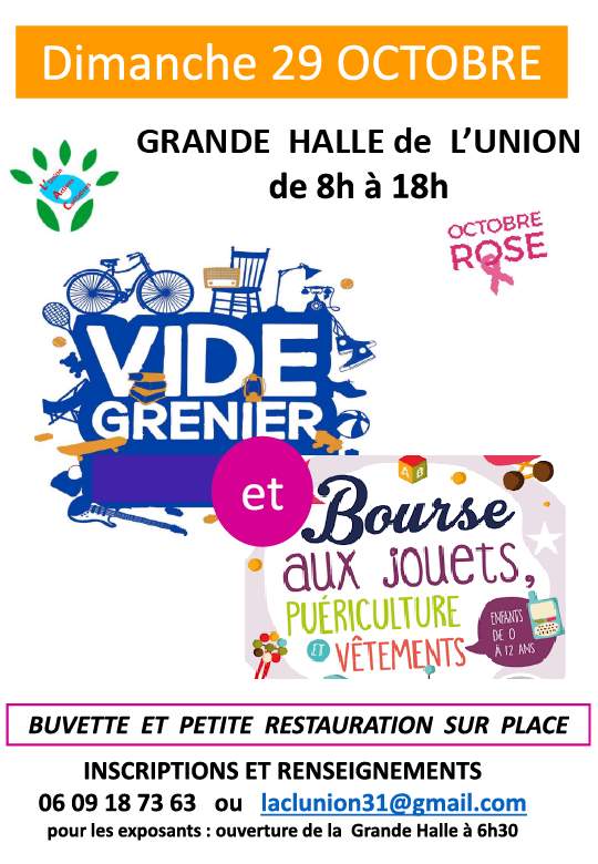 Cette bourse aux jouets/Vide grenier aura lieu le 29 octobre 2023 à la grande Halle de L’UNION de 8h à 18h pour le public