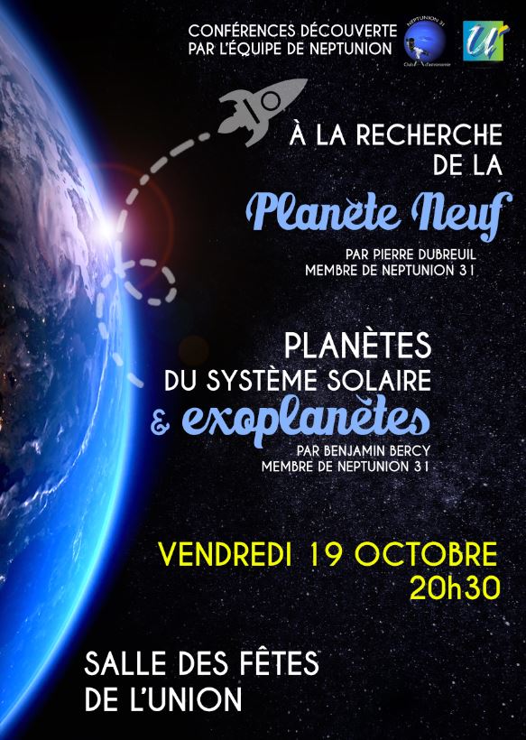 L’association Neptunion31 vous propose deux conférences qui traiteront des planètes du Système Solaire, connues ou encore inconnues et de certaines exoplanètes aux caractéristiques uniques comme leur proximité avec leur étoile ou des planètes qui errent dans l’espace interstellaire.