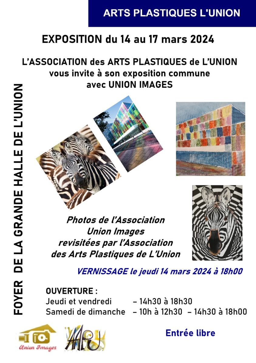 Du 14 au 17 mars 2024 – Exposition commune de l’Association des Arts Plastiques de l’Union (A.A.P.U) et de l’Association UNION Images au Foyer de la Grande Halle.
