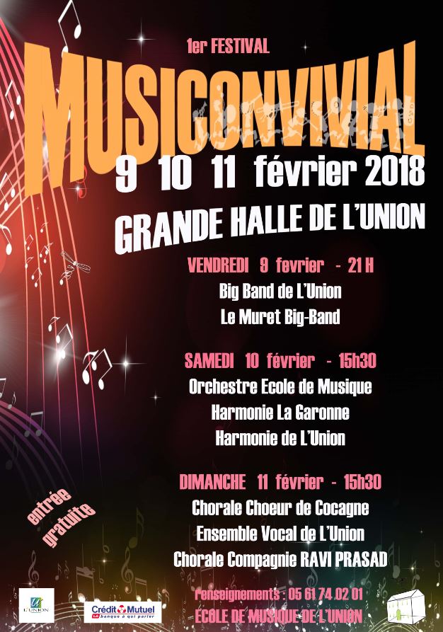-Le vendredi soir vous pourrez assister à une soirée Big Band pour découvrir le repertoire typique de cette formation avec en 1ere partie le Big Band de l’école de l’Union dirigé par Jean-Charles Froux suivi du talentueux Muret Big Band dirigé par Dominique Rieux ! Rdv à la Grande Halle à partir de 21h.