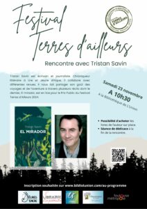 Dans le cadre du Festival Terres d’ailleurs qui se tiendra au Museum de Toulouse et sur la Métropole du 21 au 24 novembre, la Bibliothèque a le plaisir d’accueillir l’écrivain et journaliste Tristan Savin pour son dernier livre « El mirador » paru en 2023 aux éditions Arthaud, en partenariat avec la Mairie de L’Union et la Librairie les Passantes.