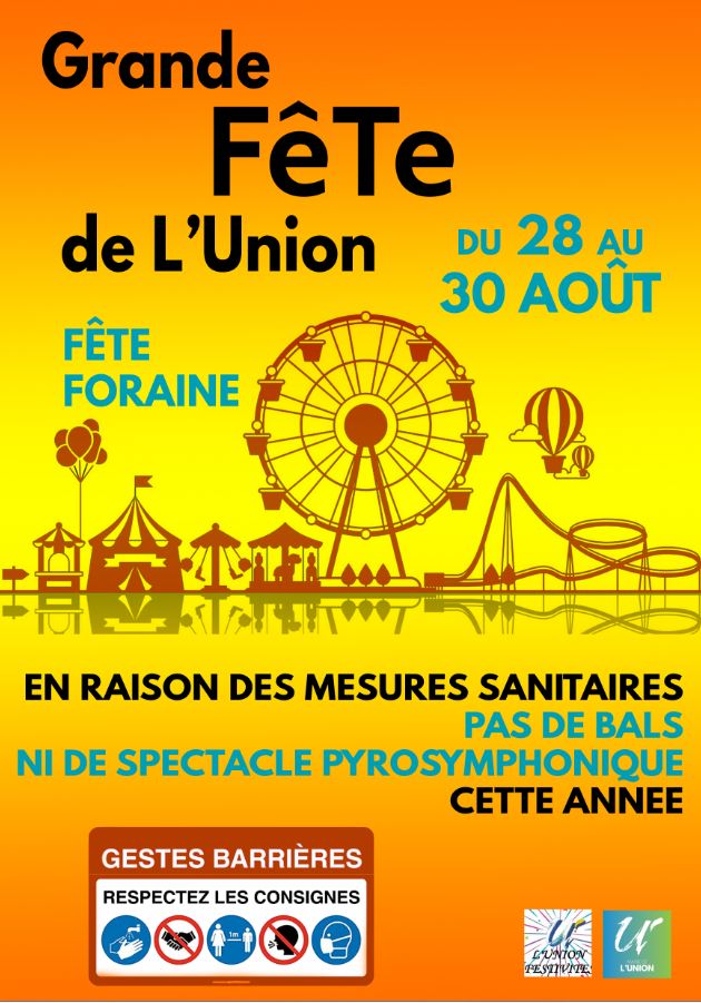 La traditionnelle fête de L’Union se tiendra les 28, 29 et 30 août prochains, devant la Grande Halle. Mais un important protocole sanitaire sera mis en œuvre, et le feu d’artifices est annulé. Voici un point complet sur le dispositif.