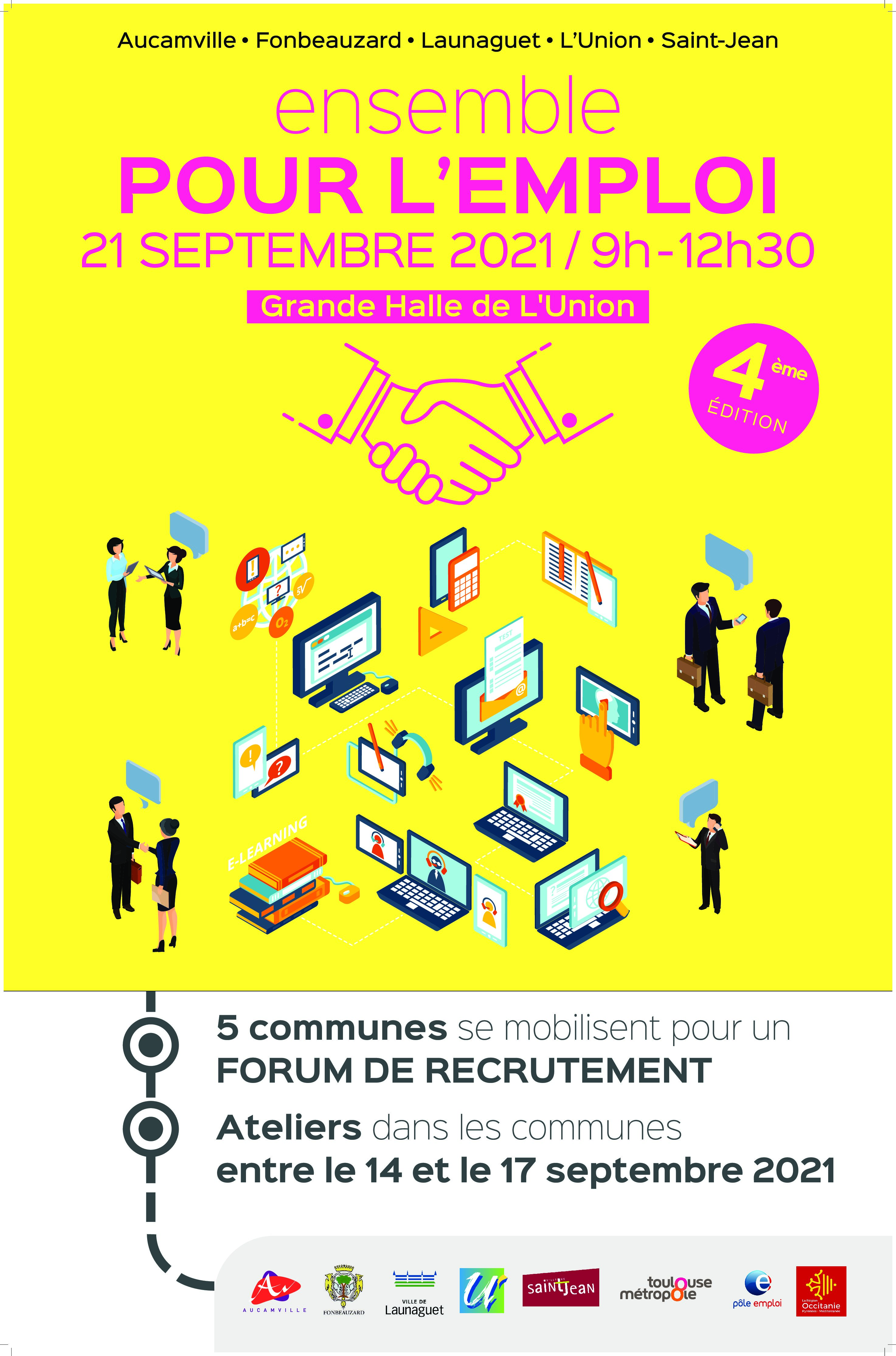 Pour la quatrième année consécutive, le forum de l’emploi intercommunal aura lieu le mardi 21 septembre à la Grande Halle de L’Union. Il s’agit d’un forum de recrutement intercommunal qui se déroulera également sur d’autres communes voisines (Launaguet/ Fonbeauzard/ Aucamville/ St Jean). Le forum de recrutement se déroule sur la commune de L’Union mais en amont des ateliers de préparation sont organisés dans toutes les communes partenaires (Launaguet/ Fonbeauzard/ Aucamville/ St Jean/L’Union)