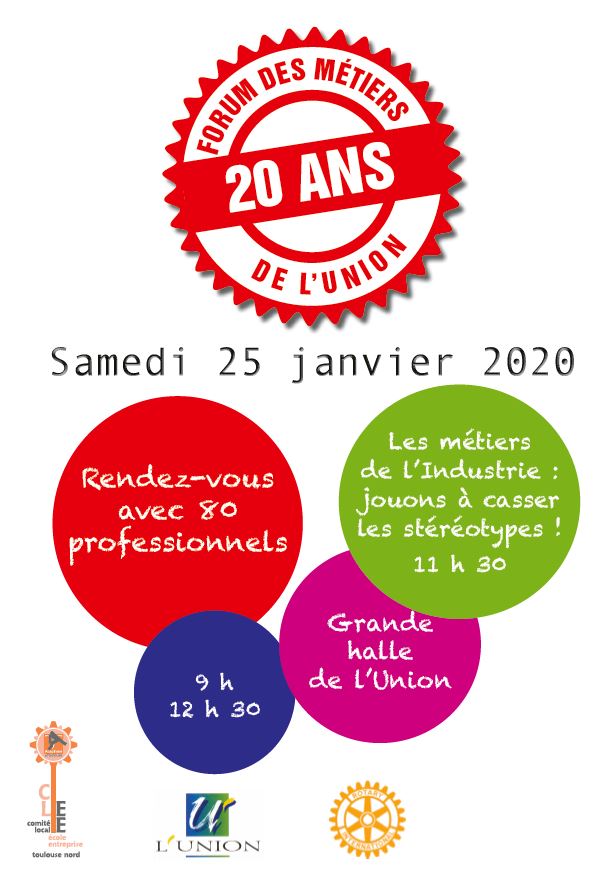 Il y a 20 ans, le premier Forum des Métiers voyait le jour à l’Union, né d’une collaboration entre la mairie de l’Union, le comité local Ecole Entreprise Toulouse Nord et plusieurs clubs Rotary : Toulouse Terre d’Envol, Toulouse Frontonnais, Toulouse, Toulouse Lauragais.