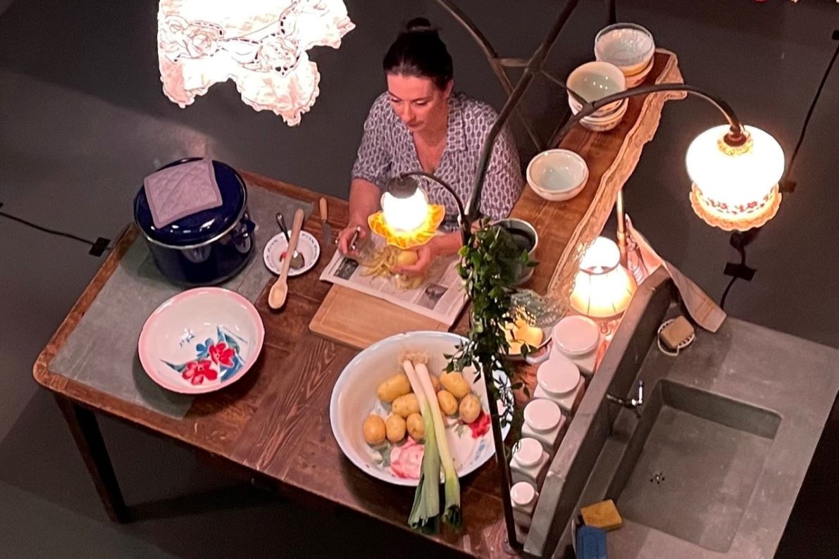 Une femme prépare une soupe de poireaux et parle aux personnes qui sont là et l’écoutent. Elle les nourrit du fruit de son travail de mots et d’idées avant de les nourrir de la soupe qu’elle aura préparée.