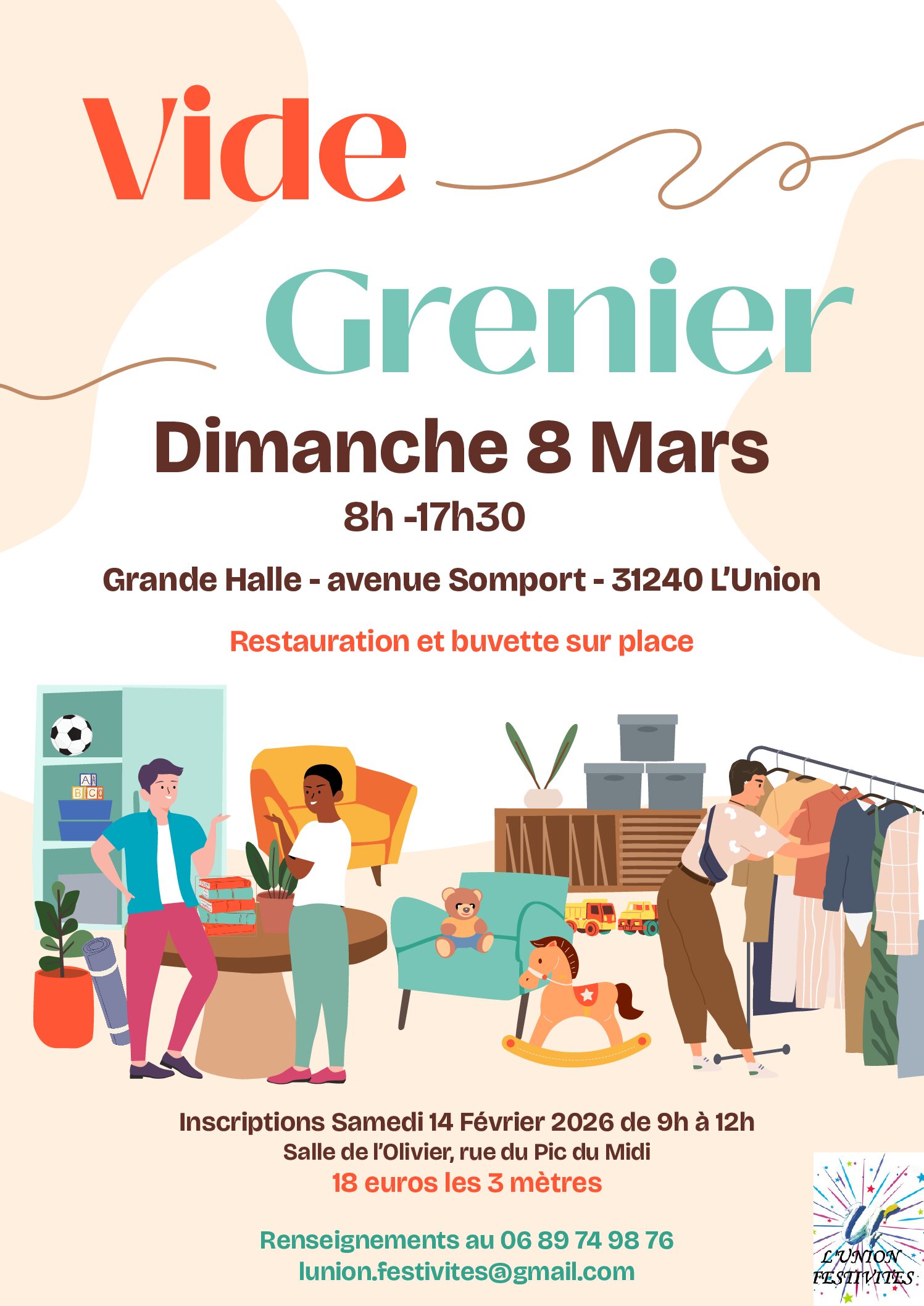 L’Union Festivités organise son traditionnel vide grenier le dimanche 8 mars 2026, de 8h à 17h30, à la Grande Halle de L’Union, rue du Somport.
