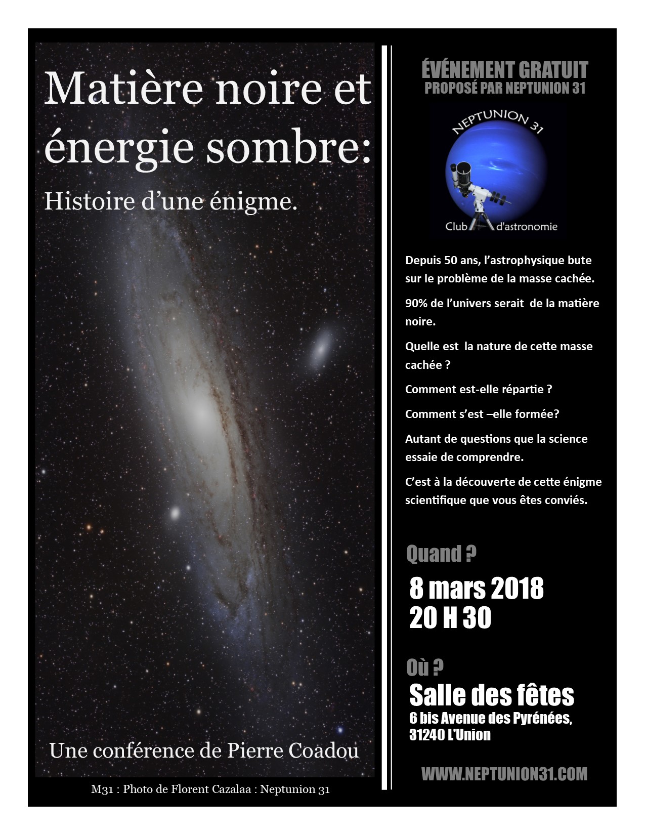 C’est à la découverte de cette énigme scientifique que vous êtes conviés le vendredi 8 mars 2019 à 20 h 30 à la salle fêtes de L’Union pour appréhender les natures possibles de la matière noire et l’énergie sombre qui seront sûrement là … mais que vous ne verrez pas !!!