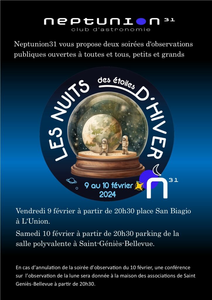 Avec le soutien de la mairie de L’Union, Neptunion31 vous accueillera sur la Place San Biagio, un vendredi par mois à partir de 20h30. Les dates des soirées d’observation publique seront publiées sur le site internet du club : www.neptunion31.com.