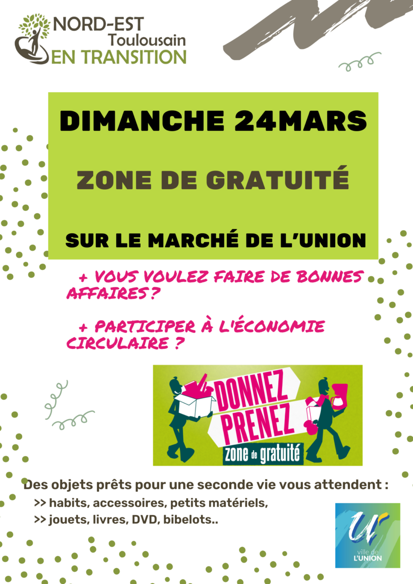 Nord Est Toulousain en Transition (NETT), un des partenaires de la ville, propose plusieurs fois par an une « zone de gratuité » au sein du marché dominical de plein vent. La prochaine édition est programmée le 24 mars, et NETT déploiera son étal place San Biagio.