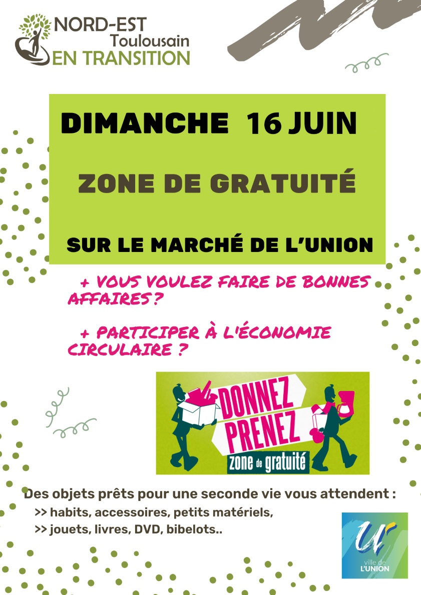 Nord Est Toulousain en Transition (NETT), un des partenaires de la ville, propose plusieurs fois par an une « zone de gratuité » au sein du marché dominical de plein vent. La prochaine édition est programmée le 16 juin, et NETT déploiera son étal place San Biagio.