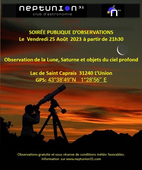 Ce rendez-vous sera bien évidemment dépendant des conditions météo qui devront être compatibles avec des observations astronomiques. C’est pourquoi il sera tout de même conseillé de vérifier l’information, sur le site internet du club : www.neptunion31.com, car il peut y avoir des modifications (annulation ou report ) selon les prévisions météorologiques.