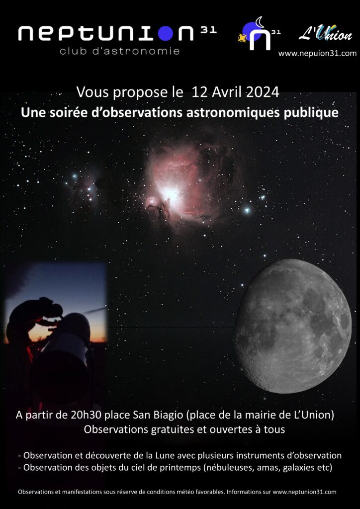 Avec le soutien de la mairie de L’Union, Neptunion31 vous accueillera sur la Place San Biagio, un vendredi par mois à partir de 20h30. Les dates des soirées d’observation publique seront publiées sur le site internet du club : www.neptunion31.com.