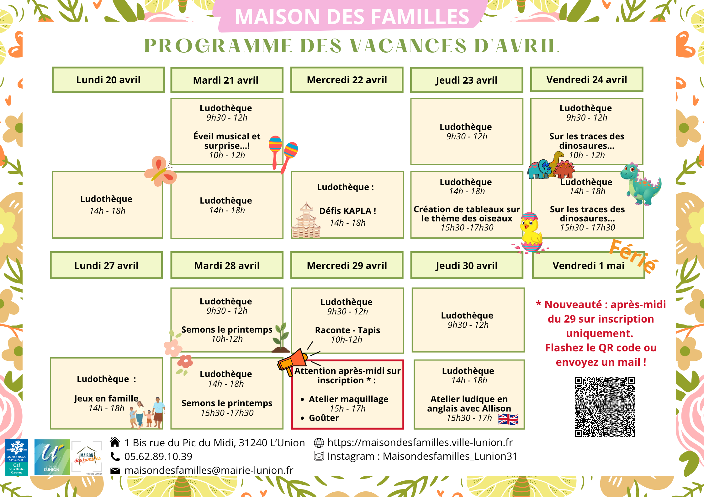 Le programme de la Maison des Familles pour les vacances d’avril, placées sous le thème du printemps🌷🌸.