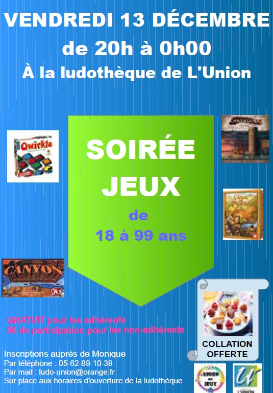 Venez (re)découvrir des jeux comme « Qwirkle », « Canyon », « Darjeeling » et pleins d’autres encore… Au cours de la soirée une collation sera offerte, par la Mairie de L’Union, pour aiguiser nos appétits de
