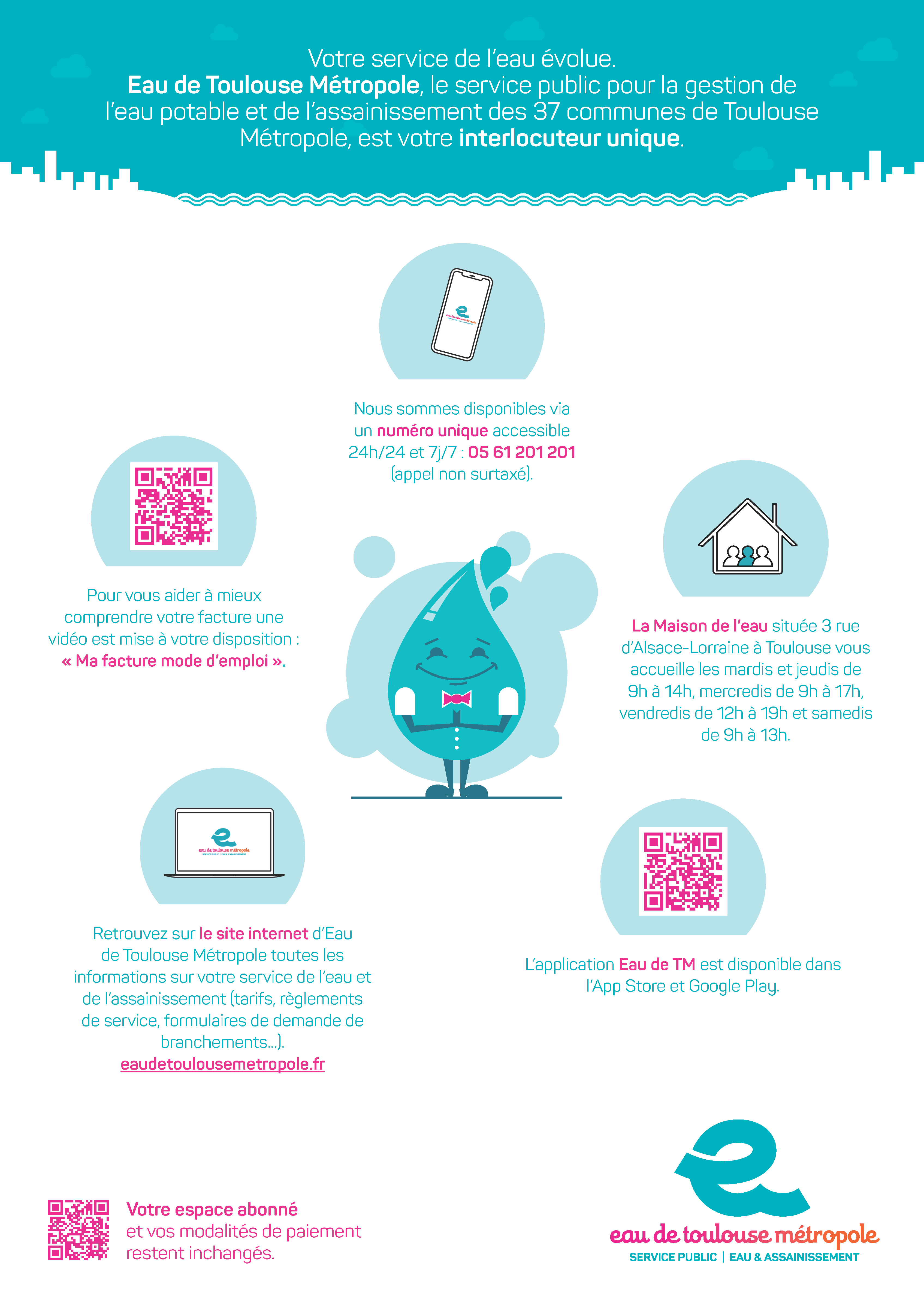 - Un site Internet unique, pour s’informer et réaliser de nombreuses démarches en ligne : effectuer la relève de son compteur, consulter et payer sa facture, etc. : eaudetoulousemetropole.fr