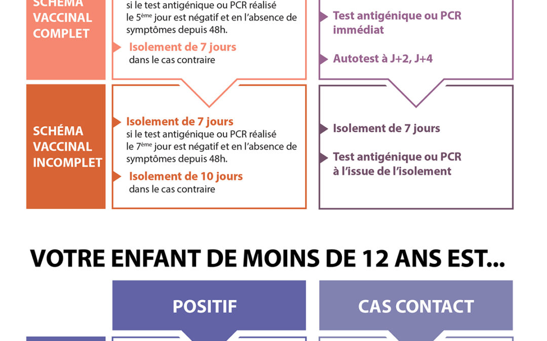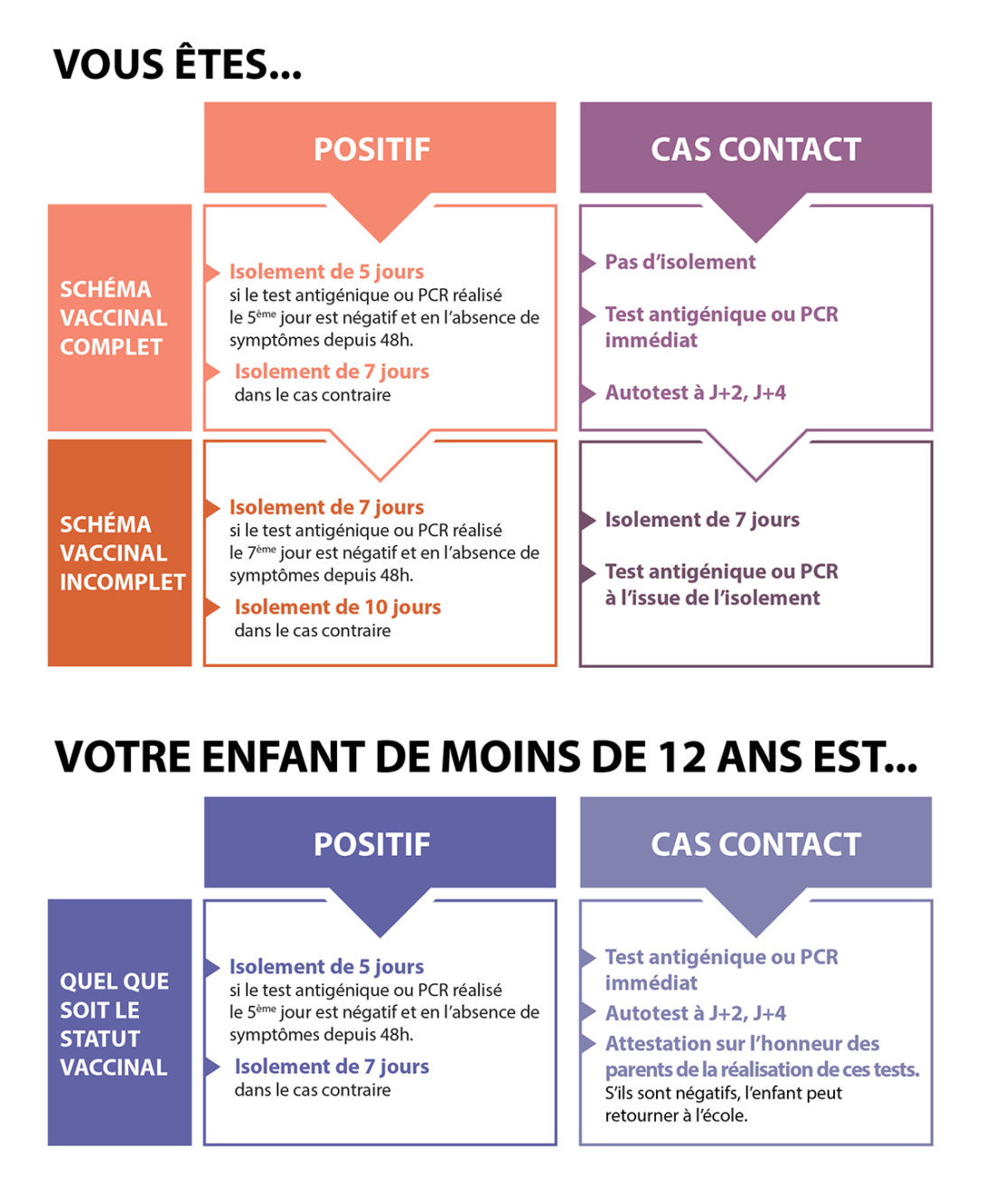 Pour faire face à l’évolution extrêmement rapide de la diffusion du variant Omicron, le gouvernement a fait évoluer les règles d’isolement depuis le 3 janvier 2022. Désormais, ces règles sont les mêmes pour tous les citoyens, quel que soit le variant (Delta ou Omicron). Vous trouverez dans le tableau ci-après une présentation des règles d’isolement selon les cas de figure. Plus d’information sur le site du Ministère des Solidarités et de la Santé.