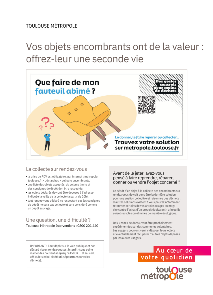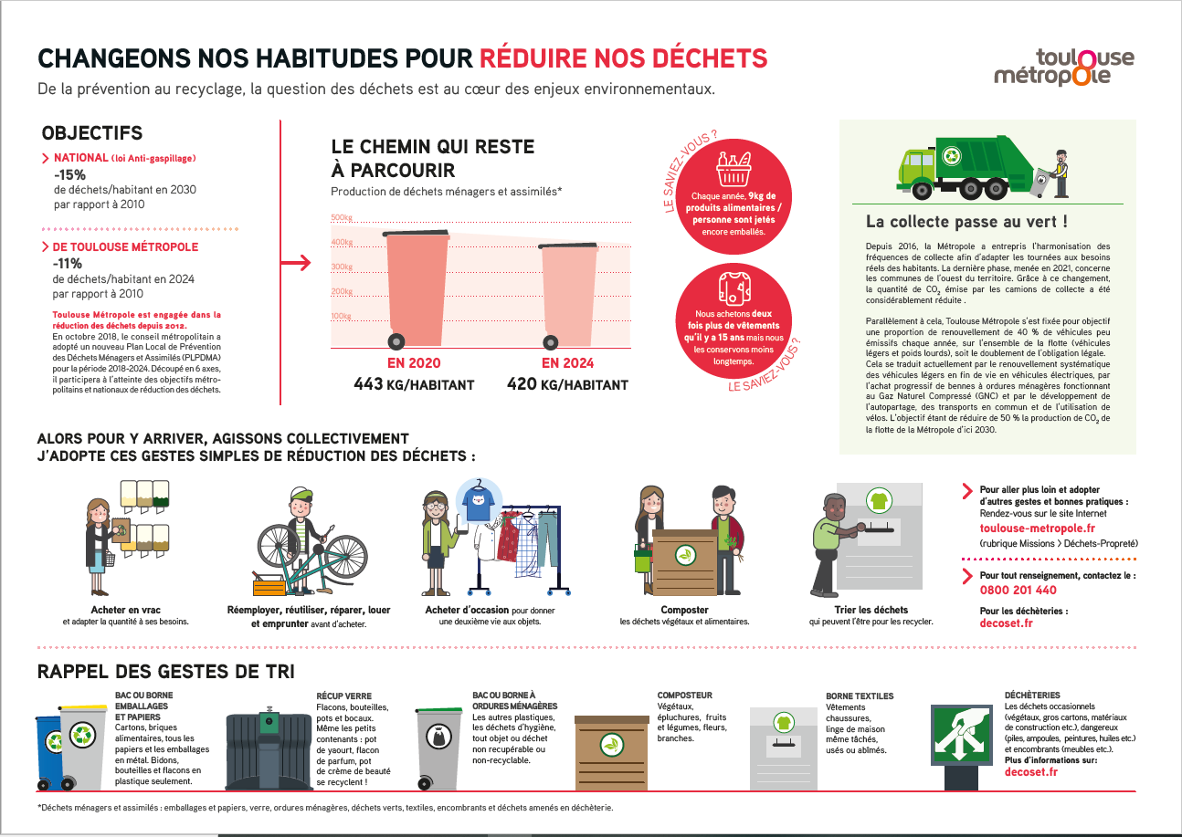Afin de réduire vos déchets, mieux trier et mieux recycler nous vous invitons à consulter la page de Toulouse Métropole Réduction des déchets
