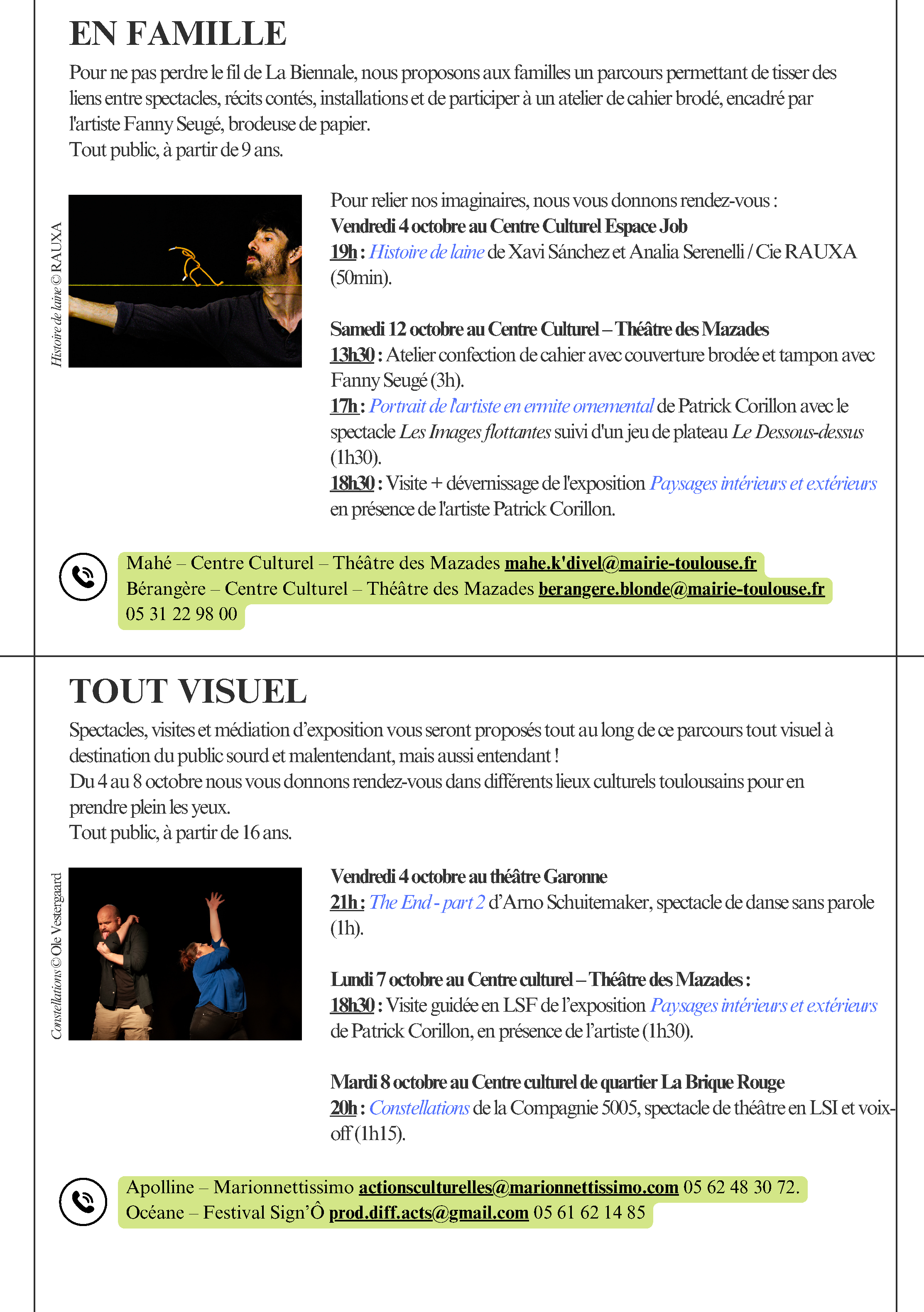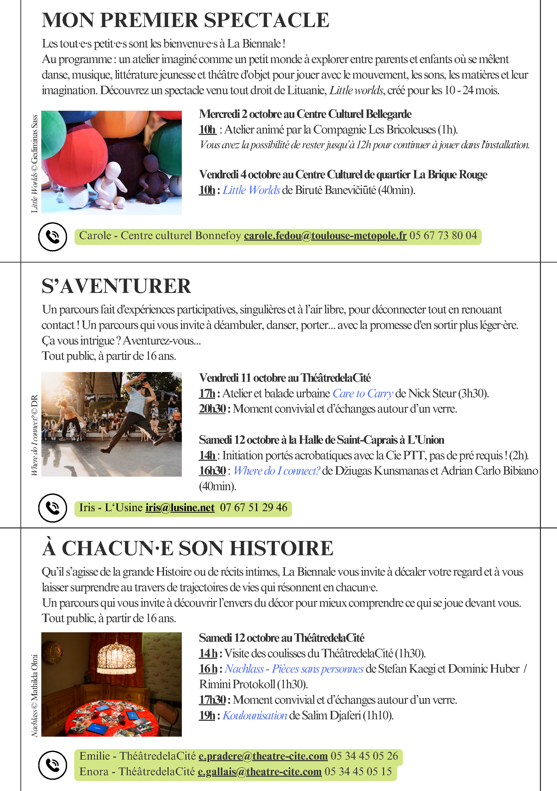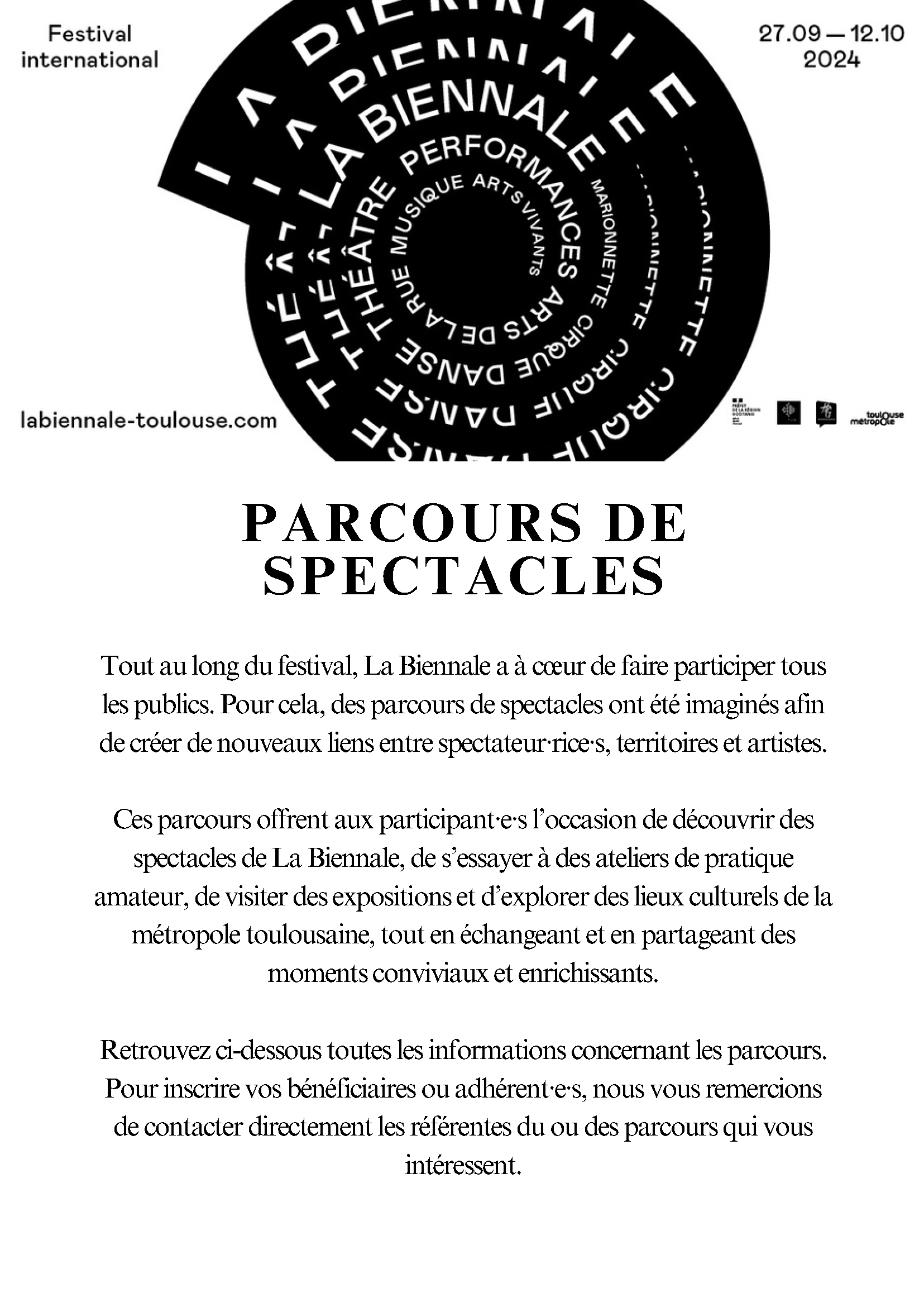 La Biennale–Festival international des arts vivants Toulouse Occitanie est portée par une quarantaine de partenaires et soutenue par le ministère de la Culture–DRAC Occitanie, Toulouse Métropole, la Région Occitanie / Pyrénées-Méditerranée et le Conseil Départemental de la Haute-Garonne.