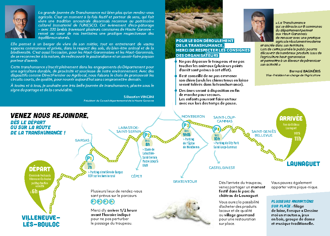 Guidé par Moïse, le berger partenaire du Conseil Départemental, les ovins continueront leur périple ce dimanche 4 mai. Plus de 400 brebis partiront de Villeneuve-lès-Bouloc à 6h pour rejoindre une nouvelle fois Launaguet à 11h. Bien que le trajet de cette transhumance ne passe pas par L’Union, la ville est partenaire de cette mobilisation annuelle. Les citoyens qui le souhaitent pourront participer à un temps festif organisé au parc du château de Launaguet à partir de 11h ce dimanche. Ils pourront apporter leur pique-nique ou encore acheter de quoi se restaurer au village gourmand, et profiter des animations en musique ou de l’atelier de tissage de laine.