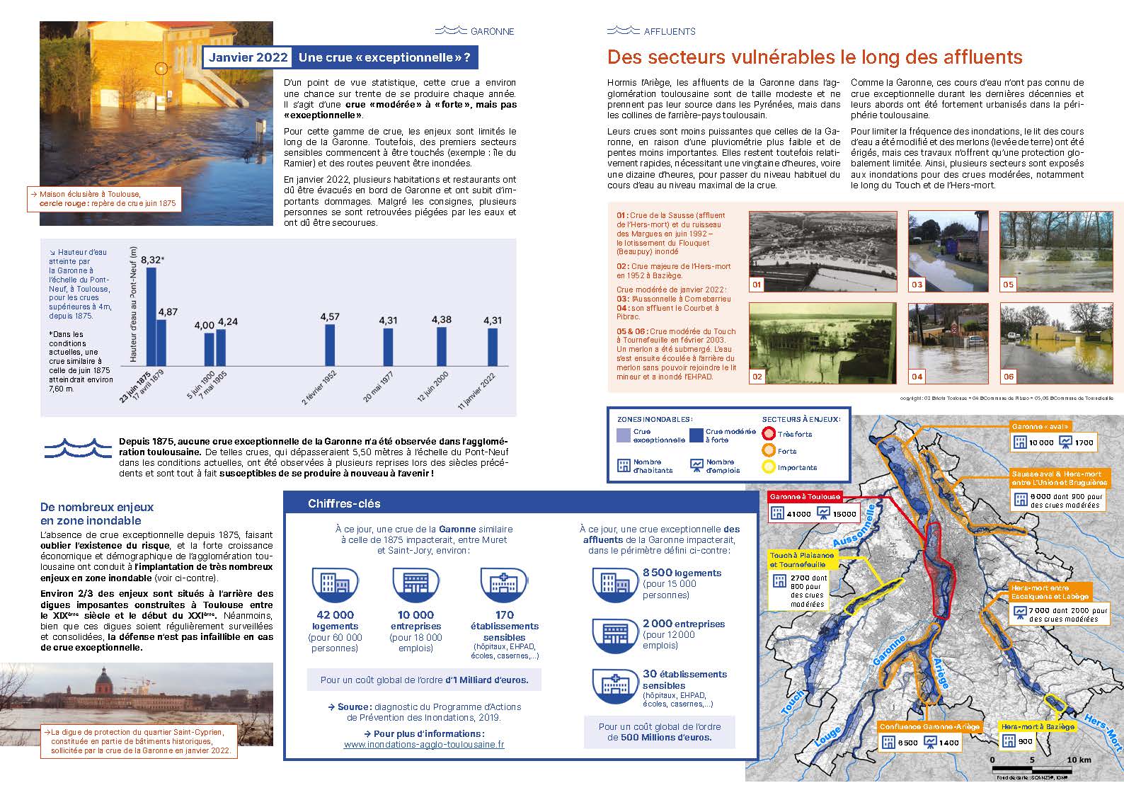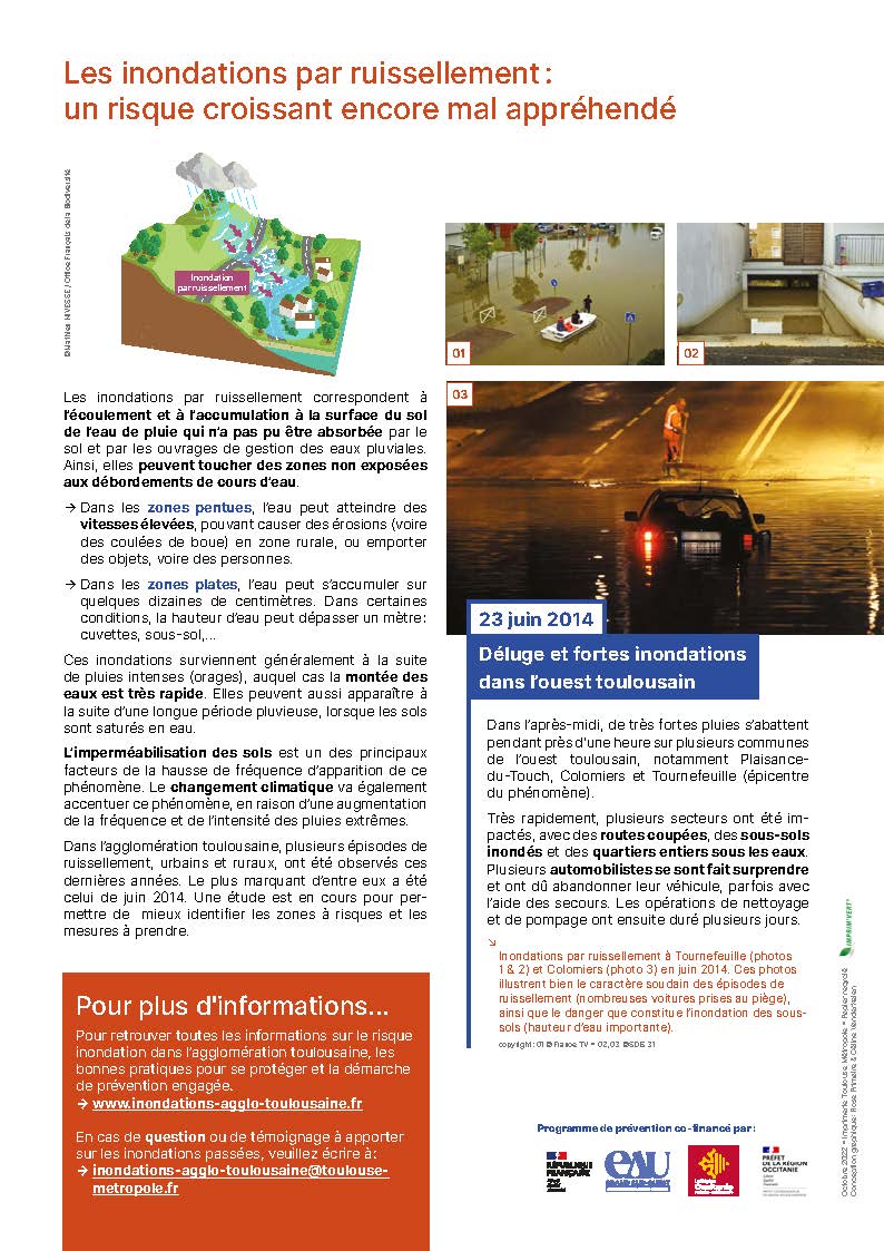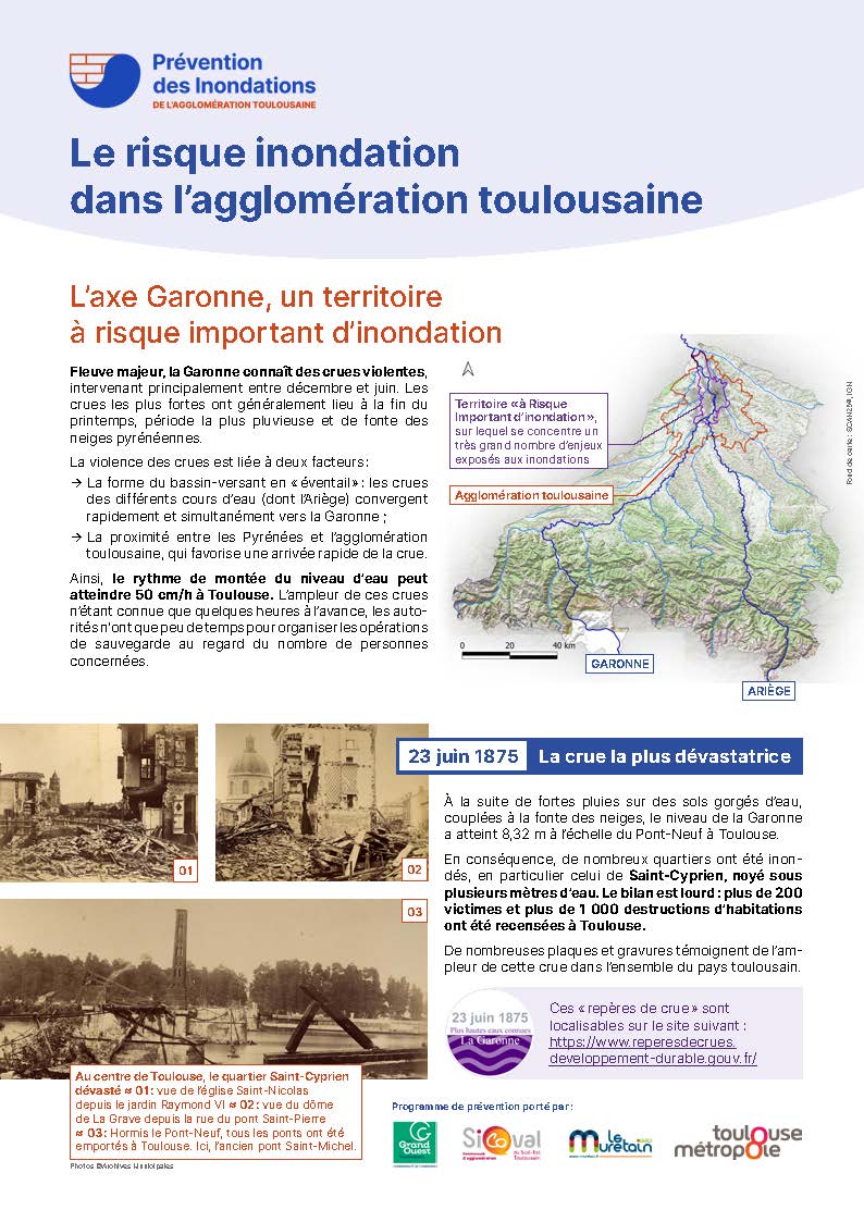 - « Le risque d’inondation dans l’agglomération toulousaine» récapitulant les informations utiles sur les différents types d’inondations auxquelles est exposé notre territoire ;