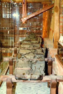– La seconde, d’époque carolingienne, découverte le 8 décembre 1988 non loin de la première, a aussi été construite dans un tronc de chêne de 7 mètres de long. Elle diffère cependant de la précédente par son façonnage. Plus récente, sa construction remonterait à la période VIII-Xe siècle de notre ère (datation au carbone 14).