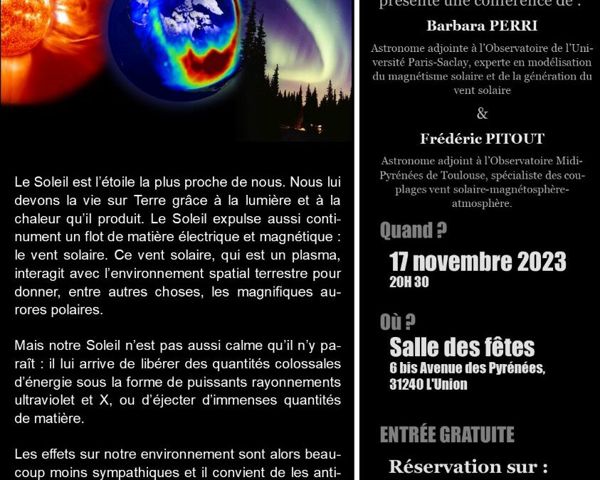 Le Soleil est l’étoile la plus proche de nous. Nous lui devons la vie sur Terre grâce à la lumière et à la chaleur qu’il produit. Le Soleil expulse aussi continument un flot de matière électrique et magnétique : le vent solaire. Ce vent solaire, qui est un plasma, interagit avec l’environnement spatial terrestre pour donner, entre autres choses, les magnifiques aurores polaires. Mais notre Soleil n’est pas aussi calme qu’il n’y paraît : il lui arrive de libérer des quantités colossales d’énergie sous la forme de puissants rayonnements ultraviolet et X, ou d’éjecter d’immenses quantités de matière. Les effets sur notre environnement sont alors beaucoup moins sympathiques et il convient de les anticiper pour protéger nos technologies, voire notre santé. Dans cette conférence, nous ferons le point sur l’état des connaissances des relations Soleil-Terre ainsi que les efforts de prévision qui constituent les contours d’une science récente : la météorologie de l’espace.