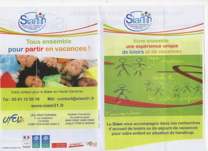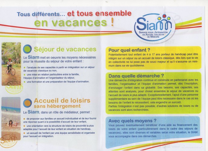 « Si vous envisagez des vacances pour votre enfant porteur de handicap sur un séjour ou un accueil de loisirs classique, le SIAM (service pour l’intégration en accueil collectif de mineurs) qui accompagne les familles dans leurs recherches d’accueil de loisirs ou de séjour de vacances pour leurs enfants de 4 à 17 ans, en situation de handicap, peut vous être utile ».
