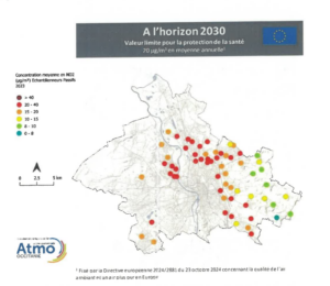 Sur la commune, les mesures respectent actuellement les seuils réglementaires, mais certains sites proches des axes routiers pourraient dépasser les futures normes européennes prévues pour 2030.