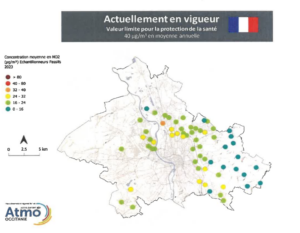 Sur les cartes suivantes, les points correspondent aux lieux précis d’études réalisés par l’ATMO sur une longue période et qui permettent ainsi d’obtenir des données fiables quant à l’exposition au NO₂.