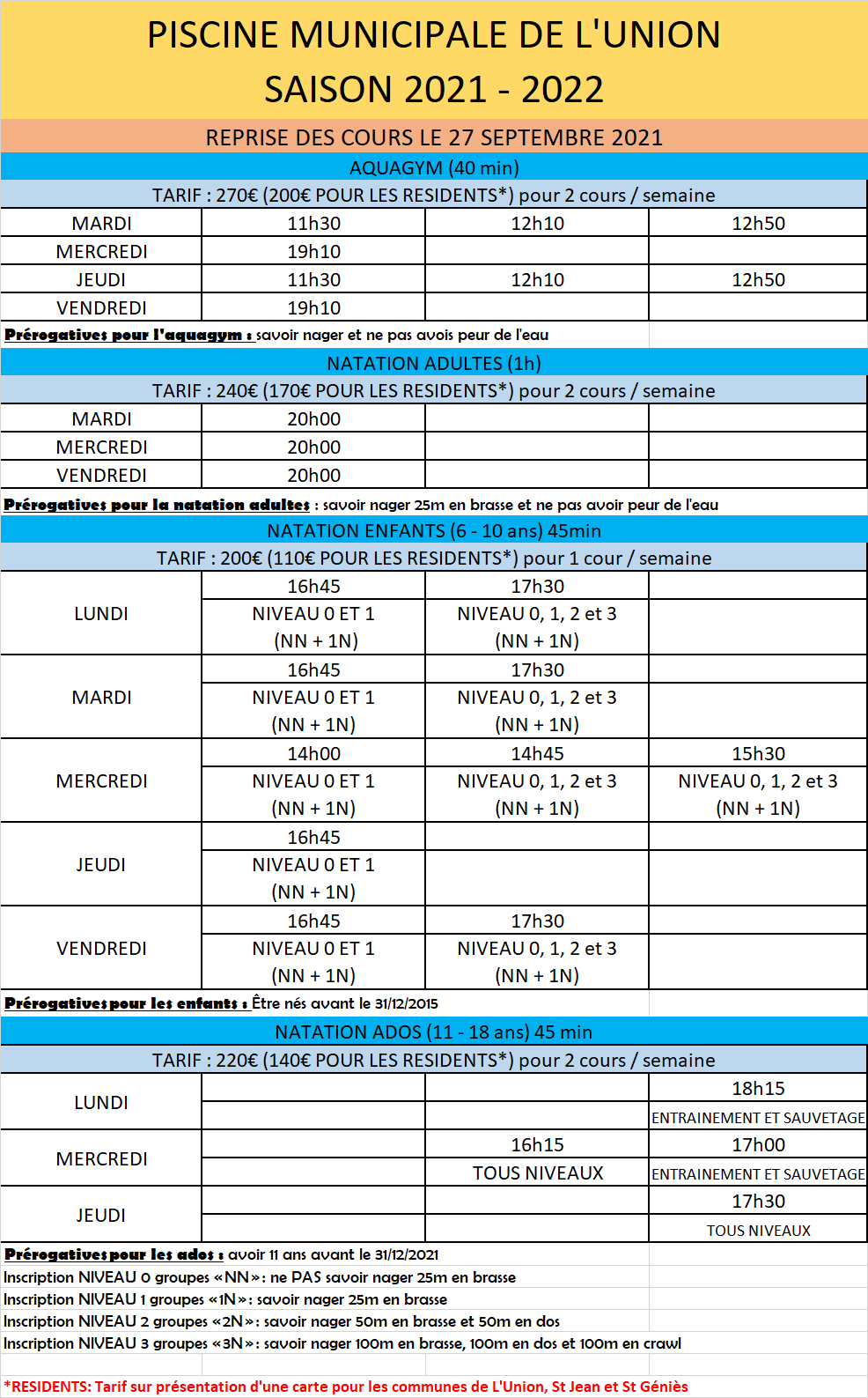 Les inscriptions à  l’école de natation municipale pour la saison 2021-2022 auront lieu le samedi 4 septembre à partir de 9h précise. Il ne sera possible de télécharger le dossier d’inscription qu’à partir de cette date. Ces dossiers seront disponibles sur le site de la Mairie de L’Union, en téléchargement, ou en format papier sur le stand de la piscine à l’occasion du Forum des associations (stade Georges Beyney). Les dossiers, une fois complétés, devront être ensuite envoyés par mail ou déposés à l’accueil de la maison des sports.