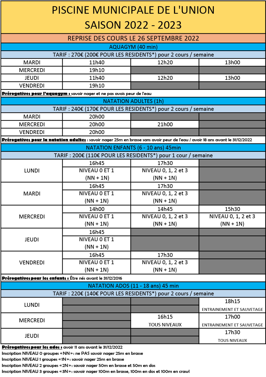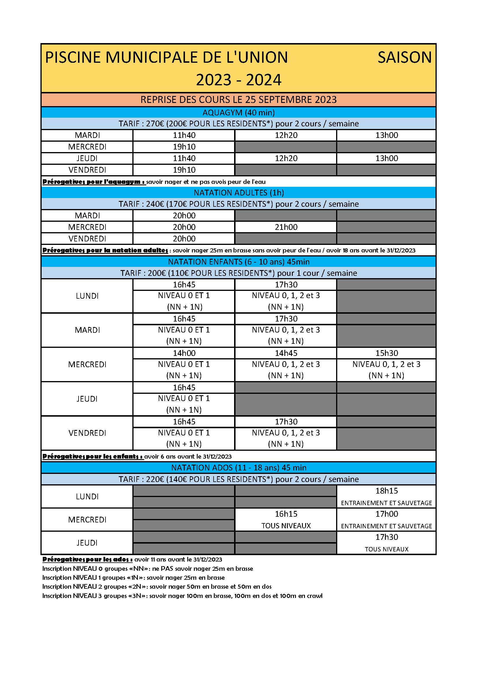 NATATION ADULTES : avoir 18 ans avant le 31/12/2024 et savoir nager au minimum 25m sans avoir peur de l’eau. 2 cours possibles par semaine. Cours de 1h.