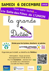 • 16h00 : 14h30-17h : «la grande dictée» avec la complicité de l’association Question pour un Champion
