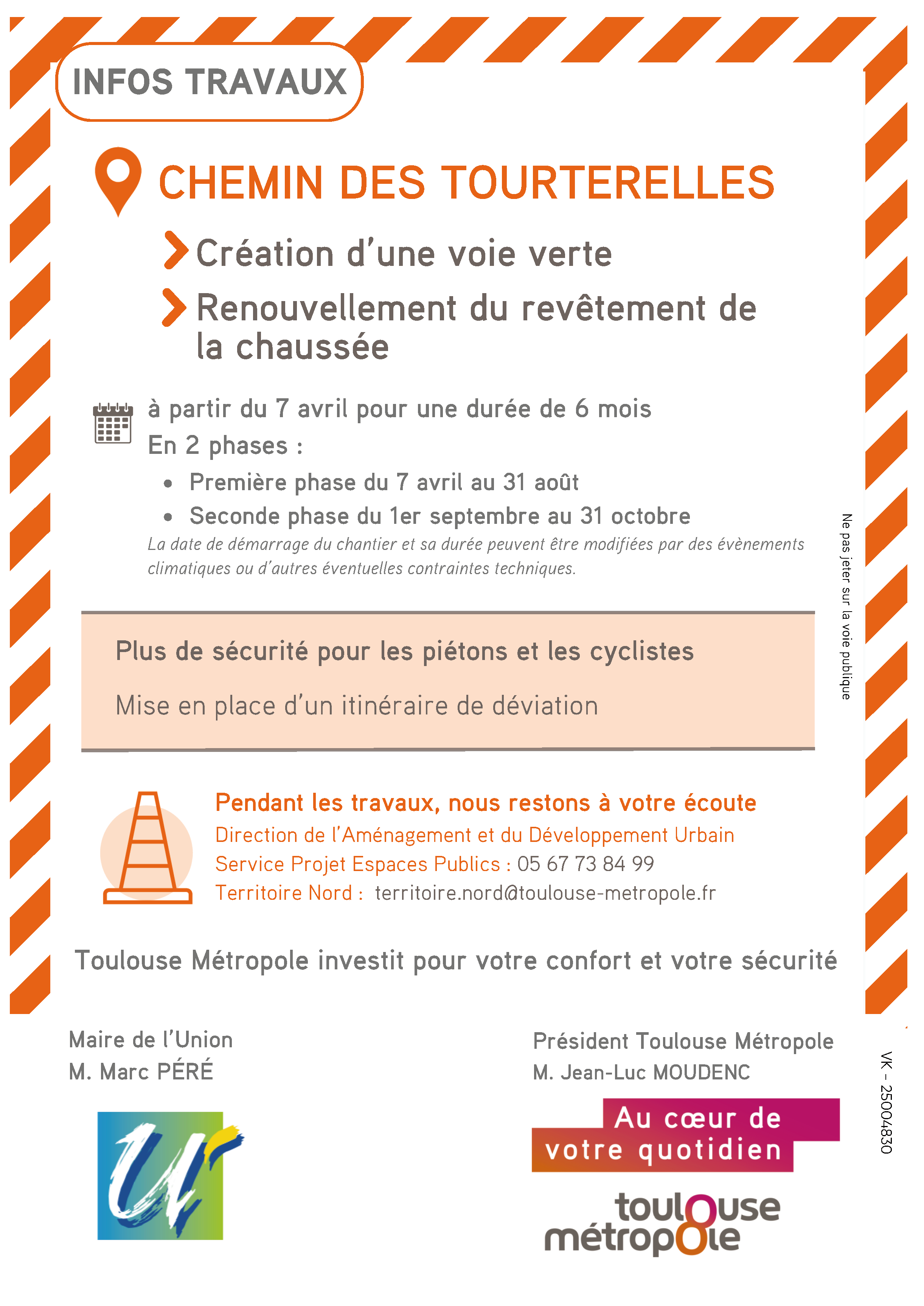 Le directeur de l’Aménagement et du Développement Urbain du Territoire Nord, Monsieur Gilbert Rouquet et le service Projets Espaces Publics (05.67.73.84.99 / territoire.nord@toulouse-metropole.fr) sont à votre écoute et à votre disposition pour vous communiquer des infonnations, recueillir vos observa tions et suggestions éventuelles sur le déroulement des travaux.