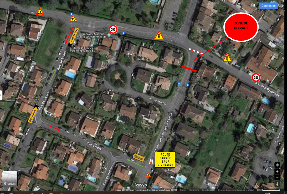 Afin de réaliser ces travaux, ces deux chemins seront fermés à la circulation pendant la durée du chantier. Une déviation sera mise en place par l’avenue des Pyrénées, les rues de Vence et Dagay (cf. plan). L’accès aux riverains ainsi qu’aux livraisons sera maintenu le mieux possible. Nous invitons par ailleurs les Personnes à Mobilité Réduite (PMR) qui auraient des difficultés à se déplacer et notamment les titulaires de la Carte Mobilité Inclusion (CMI) à se faire connaître. Comme pour tout chantier, des gênes momentanées peuvent se produire (bruit, poussière). Sachez que tout est mis en œuvre avec les entreprises pour les minimiser.