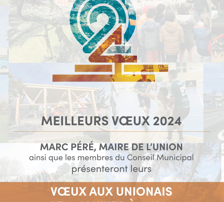Marc Péré, Maire de L’Union ainsi que les membres du Conseil Municipal vous présentent leurs meilleurs vœux pour l’année 2024 et à cette occasion, la municipalité vous convie à la cérémonie des vœux 2024 aux Unionais qui aura lieu le mercredi 17 Janvier à 18h30, à la Grande Halle.